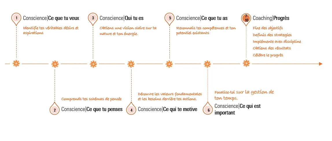 10 sessions enrichissantes, divisées en deux catégories clés : Conscience et Coaching.